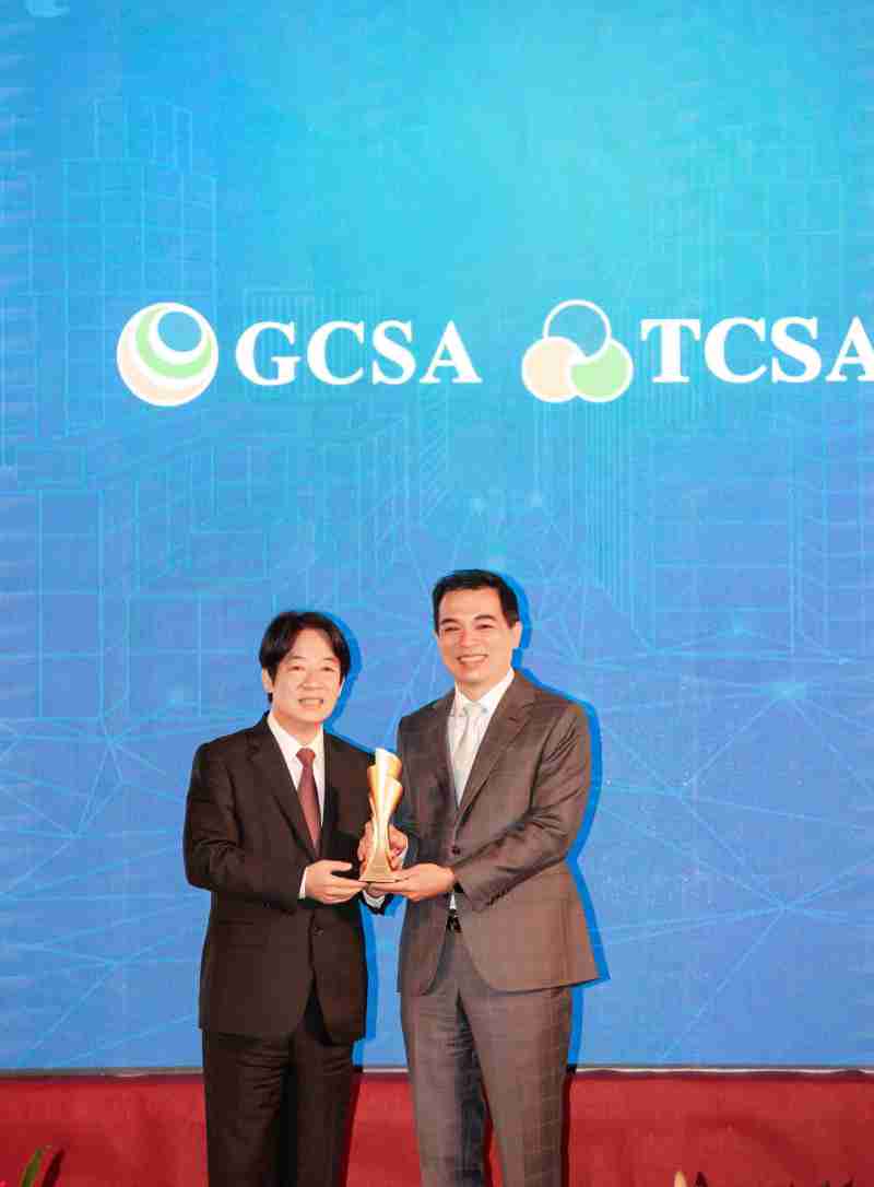 达全方位永续表现获全球永续奖及台湾永续奖肯定,,,由副总统赖清德颁奖 (左),,,菠菜论坛总经理柯富仁 (右) 代表领奖