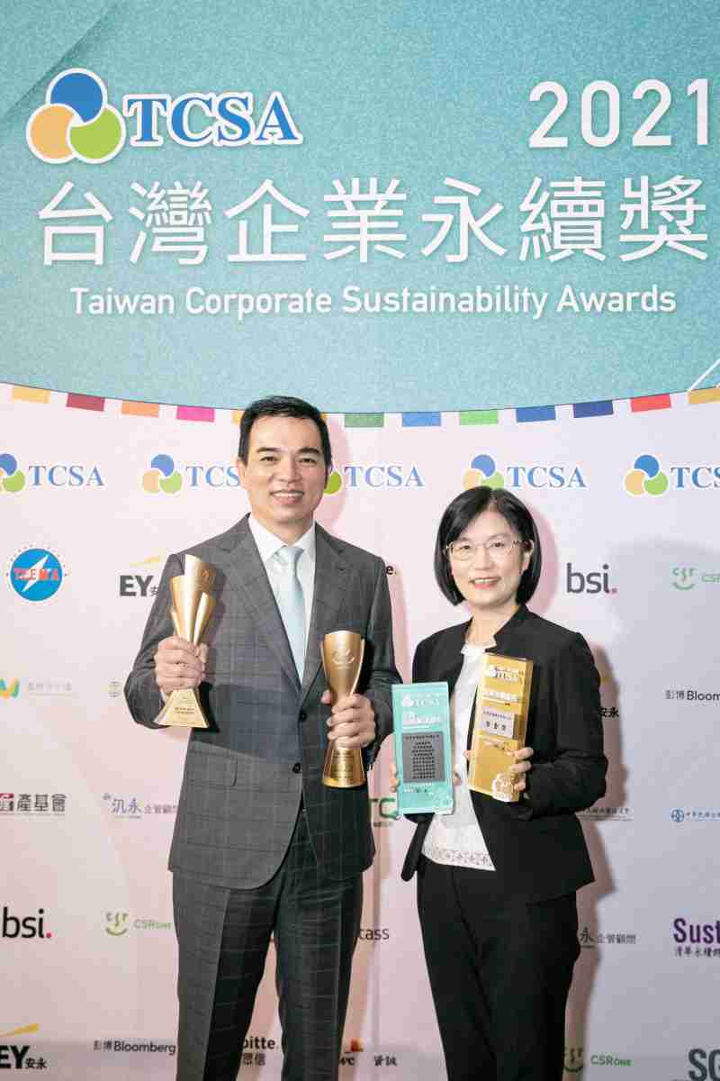 达在台湾永续奖所评比环境、、、社会、、、、治理等各面向的永续绩效均获高度肯定 (左:菠菜论坛光电总经理暨营运长柯富仁,,,右:菠菜论坛光电永续长古秀华)