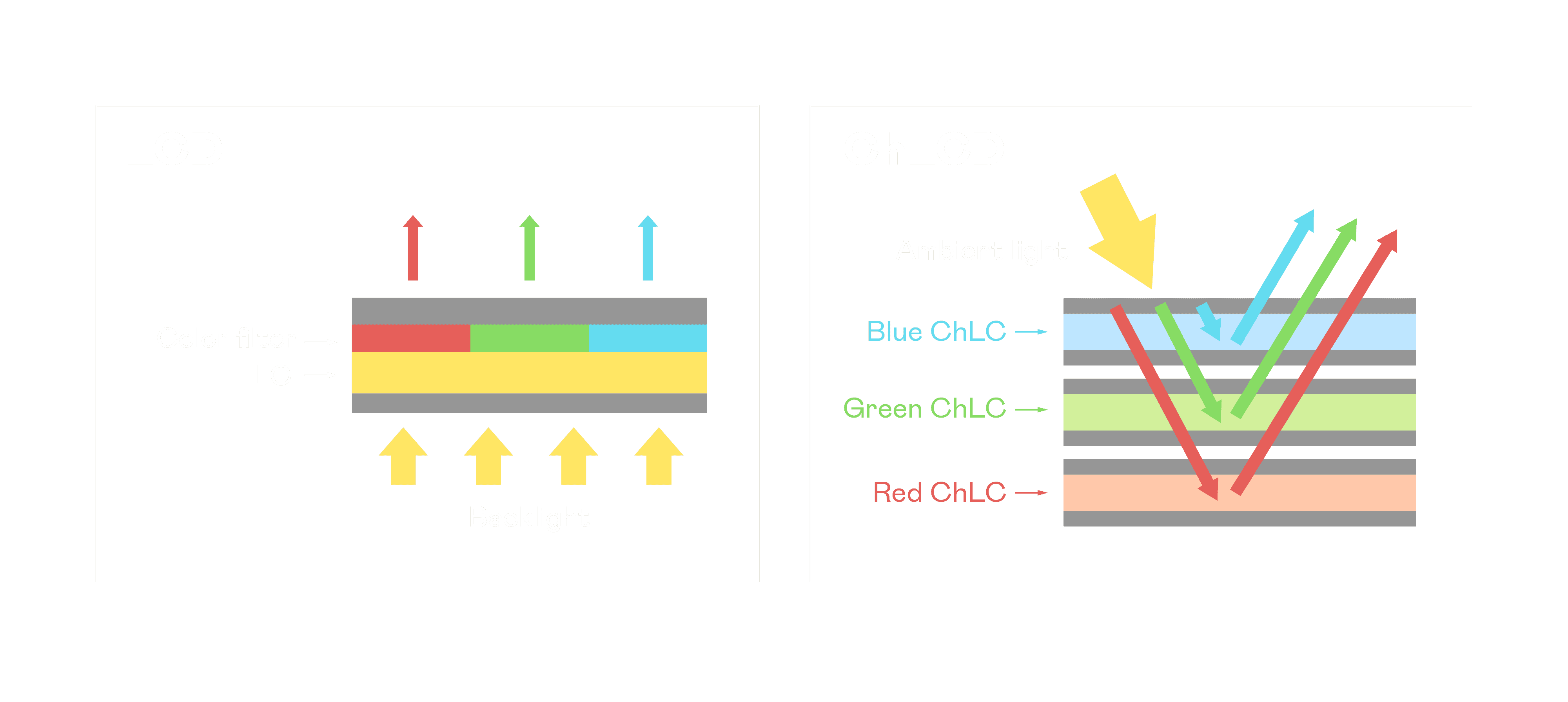 ChLCD 胆固醇液晶就如同纸张一样,,,透过反射环境光来显示影像,,,因此长时间观看不易造成人眼视觉疲劳,,,,可达到护眼效果。。。当处于户外阳光下使用,,,,LCD 影像容易失真而不易观看,,但胆固醇液晶仍可维持较佳的影像品质。。。